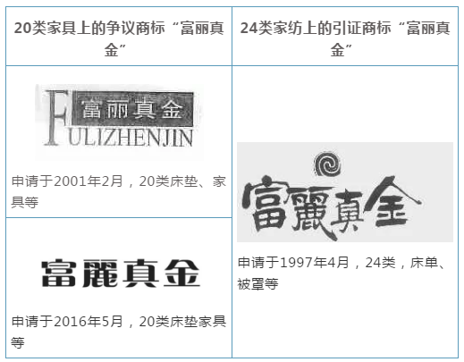 “富丽真金”这一品牌来源于创始人、法定代表人杜富元及其夫人杜郭丽英两人名字中的“富”及“丽”字,“真金”是两人对离开台湾到大陆创业,对其感情及事业发展的愿景。在确权行政诉讼中,富丽真金家具公司无法对该注册商标的命名提出合理解释,兼之其法定代表人陈文圣在不正当竞争诉讼中当庭承认,“考虑到家纺公司的富麗真金品牌在市场上有一定的名气,但其注册在第24类,所以我选择在第20类注册了简写的富丽真金加拼音的商标”,直接体现了申请恶意。