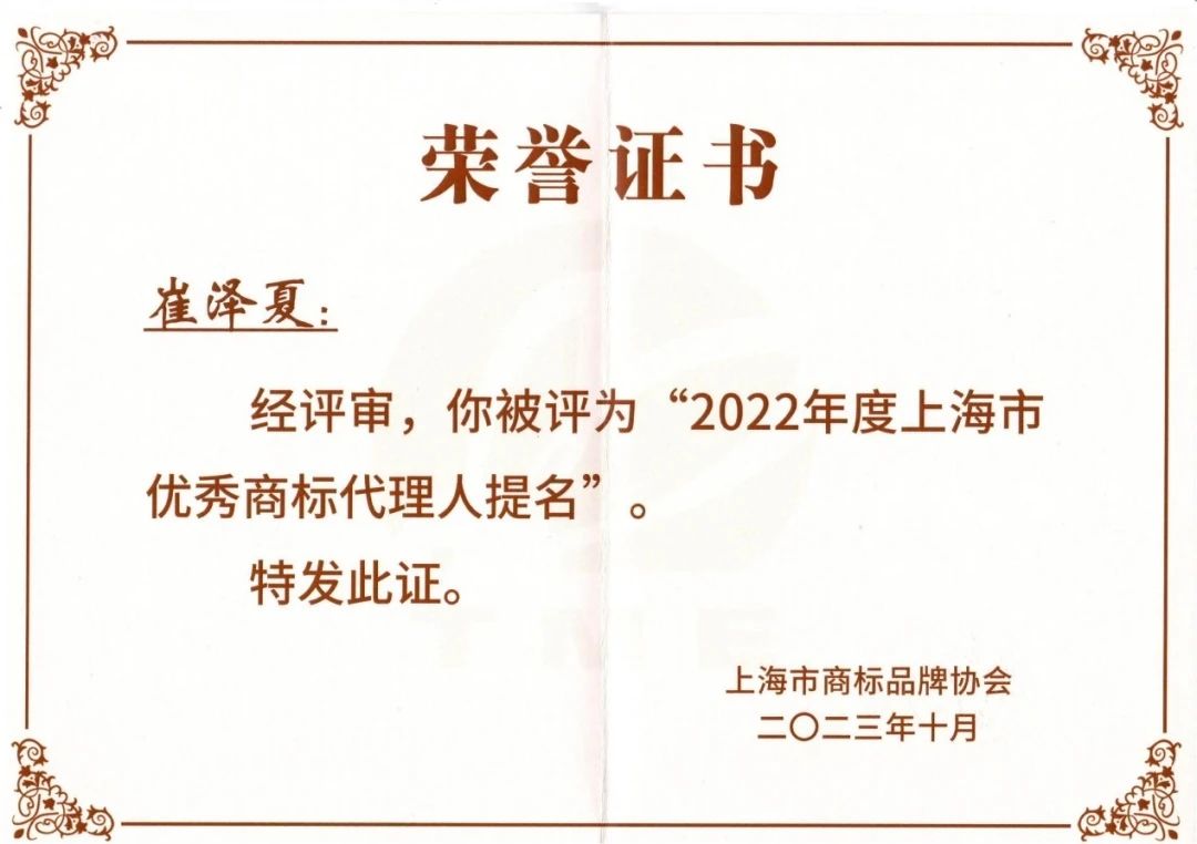 集佳上海分所崔泽夏律师获得2022年度“上海市优秀商标代理人提名”。